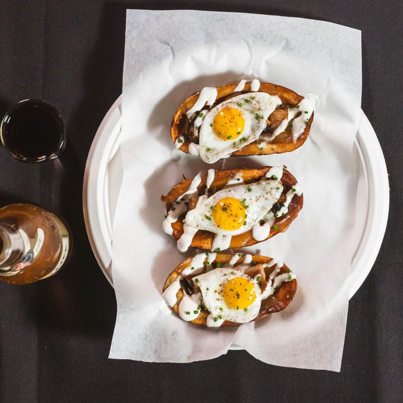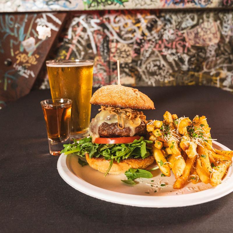 Ground schmitz ranch chuck, bacon shallot gastrique, white cheddar, arugula, spinach, tomato, crispy shallot rings, potato pepper bun • Add Bacon, Avocado $4.00 | Add Egg $2.00